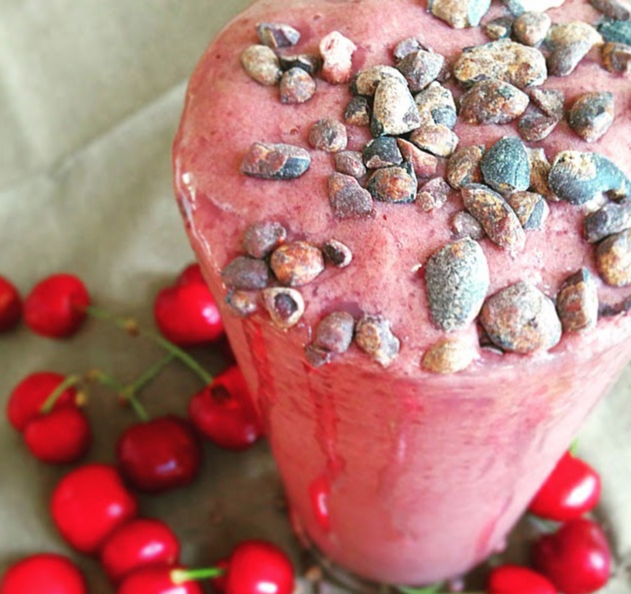 Blend all ingredients with a cup of ice & top with toasted, shredded coconut, banana, cacao