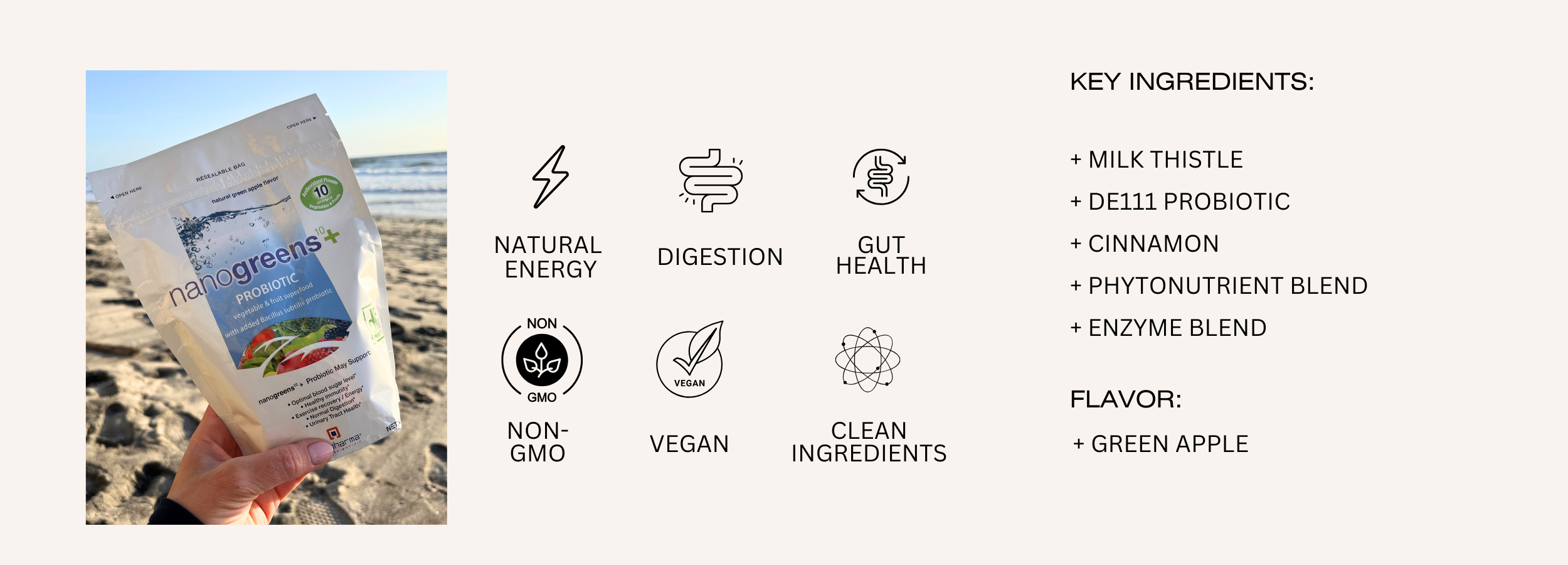 While it maintains the same great taste and nutrient-dense formula as the original, Nanogreens + Probiotic includes DE111 Bacillus subtilis, which helps promote digestive health and supports a balanced gut microbiome.