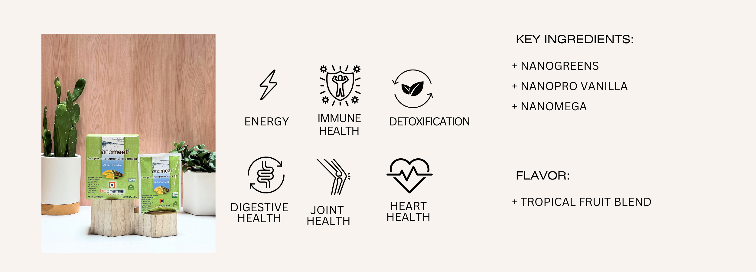 NanoMeal is an all-in-one, convenient meal replacement shake powder that supports optimal health in various areas, including the immune system, weight management, detoxification, digestion, brain function, vision, joints, heart, and the health of skin, hair, and nails. It’s also an ideal meal replacement option for any weight loss program.